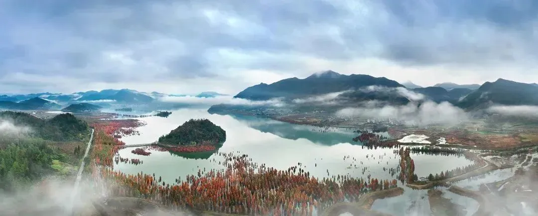 上垟乡前岸村白鹭湾湿地公园就坐落在长潭水库西南角的滩涂里。虽然说是湿地公园,并没有刻意地去打造,基本呈现出来原始的面貌,荒草萋萋,滩涂宽阔,湖水平静,湖水里生长着上百棵水杉林,成为水上森林。
