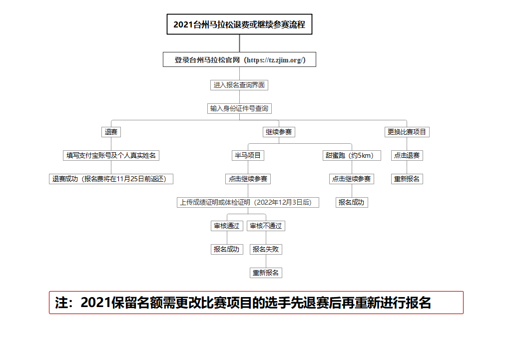 2021年的报名选手因个人原因不再继续参加2023台州马拉松的,请在11月3日-11月7日22:00前登录官网申请退赛登记,报名费将在11月25日前退回登记账号,因制作参赛物资及赛事筹备需要足够的周期,11月7日22:00前,不选择继续参赛或者不退赛的选手,默认退出比赛,名额不再保留;