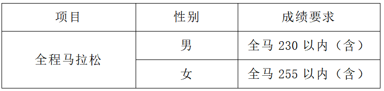 1.成绩要求:男子选手PB成绩在02:30:00(含)内、女子选手在02:55:00(含),成绩证明时间在2020年12月3日后,且为中国田径协会A1 类认证赛事;