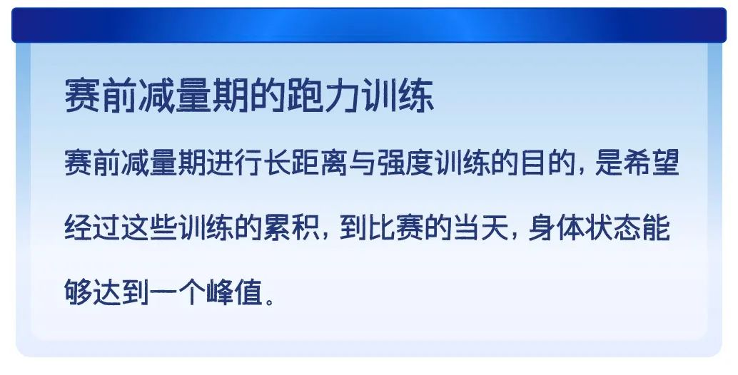 “赛前减量期”作为跑友备赛的黄金调整期,这个时候我们的跑量要适应性地下降,同时保证强度不变。因为如果我们的强度也下降的话,机体的能力也会跟着下降。